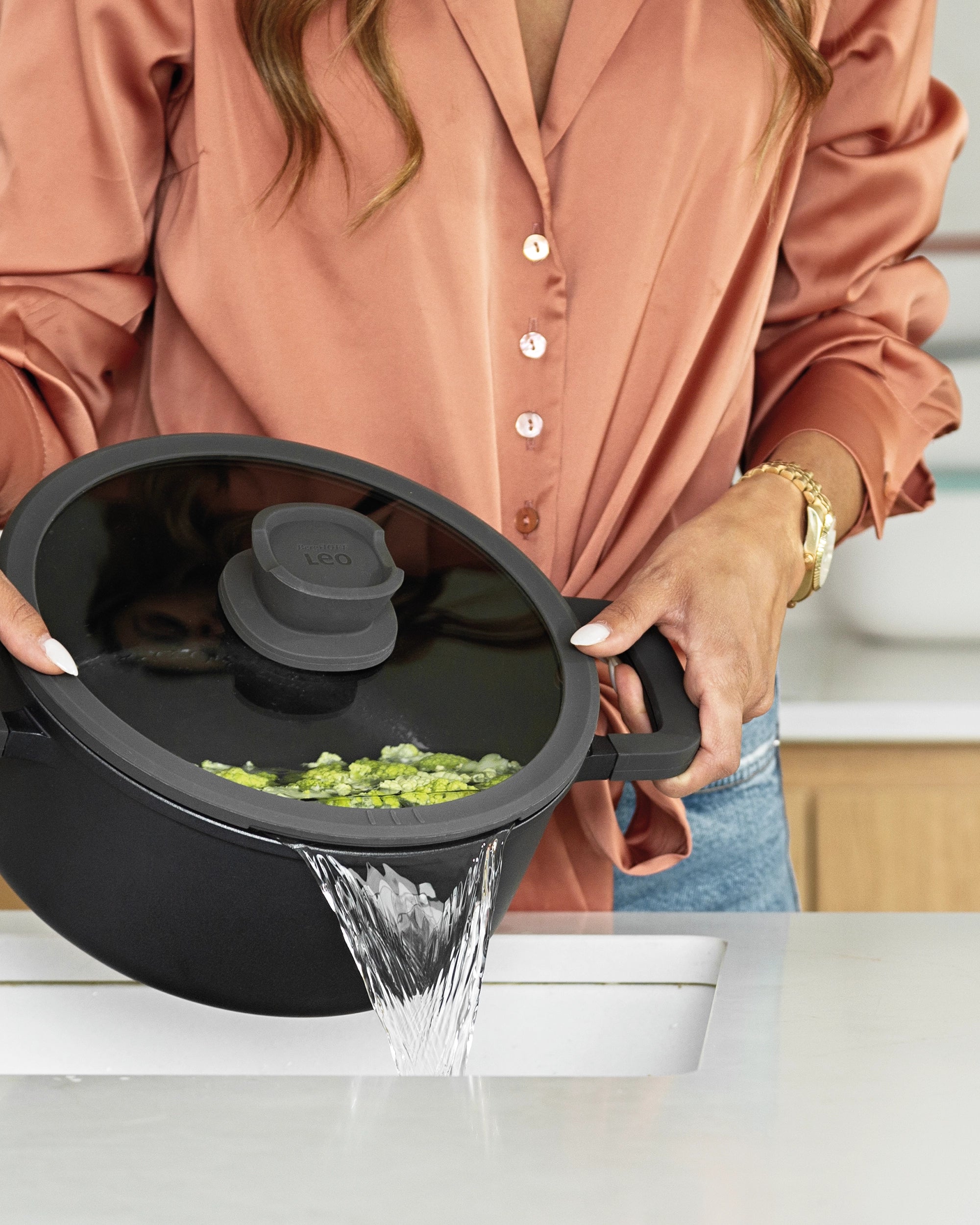 Möchten Sie Ihren Topf oder Ihre Pfanne schneller erhitzen, Ihr Essen während des Kochens im Auge behalten und es nach dem Garen einfach abgießen können? Dieser Glasdeckel ist speziell für Downdraft-Systeme entwickelt und passt auf die meisten Töpfe und Pfannen mit einem Durchmesser von 20 cm. Er verfügt über eine integrierte Abgießfunktion, einen Silikonrand, der ein Klappern verhindert, und einen weichen, hitzebeständigen Griff für einen sicheren und bequemen Halt.